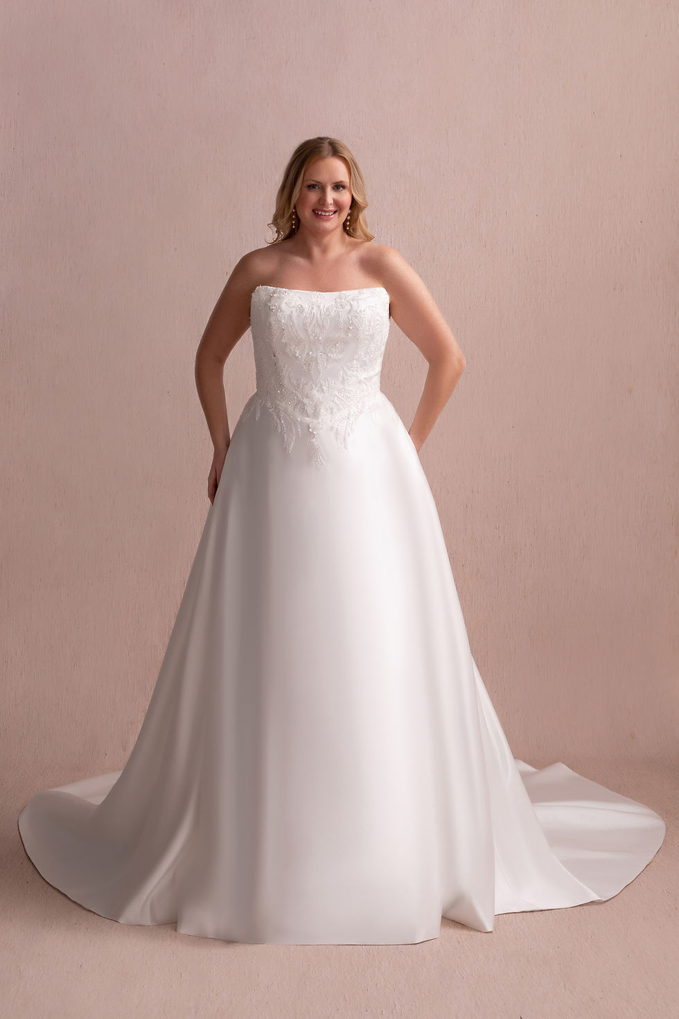 MG281-Strapless lace bodice soft scoop neckline with A-line skirt in satin