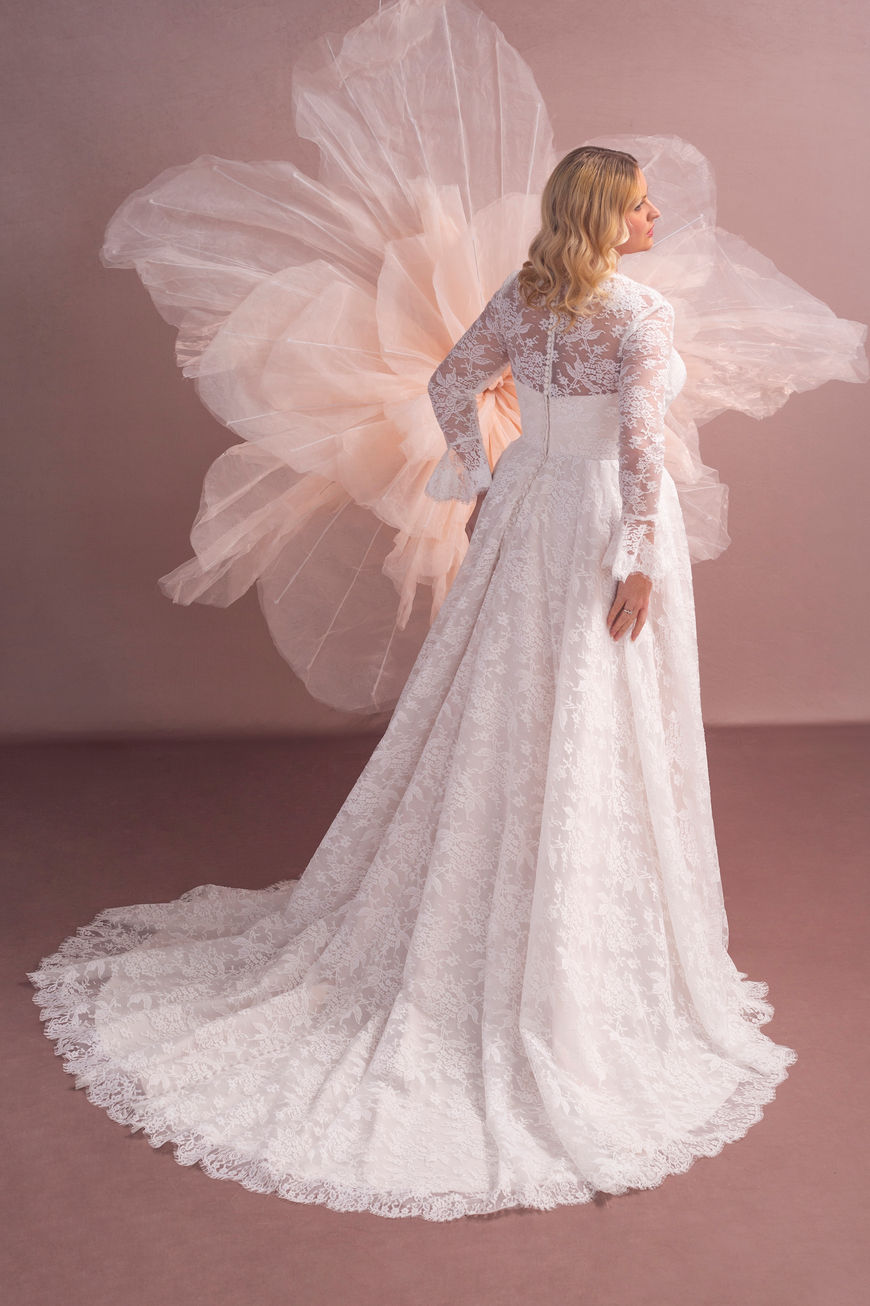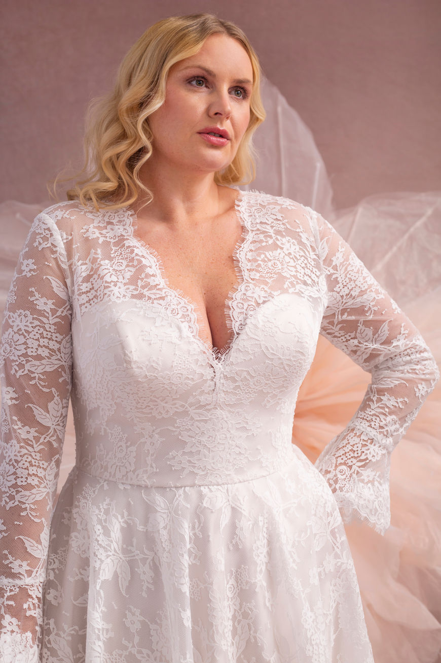 This plus size Chantilly lace A-line wedding dress exudes classic romance with its scalloped V-neckline, delicate long lace sleeves, and soft flowing silhouette. Perfect for curvy brides who love timeless elegance and refined detail.