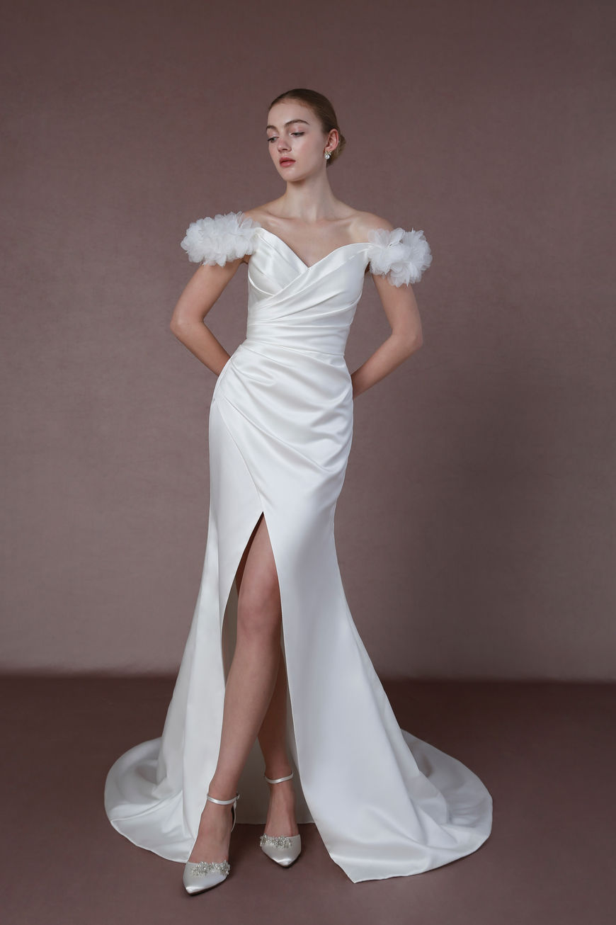 Soft ruched fishtail dress with front V opening on skirt, flower strap detail.