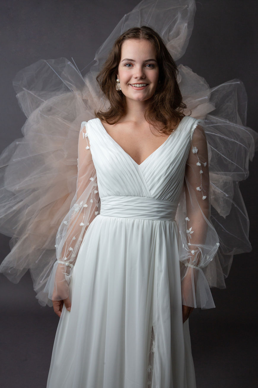 MM282-Soft Ruched chiffon wedding dress with detachable lace, puff sleeves