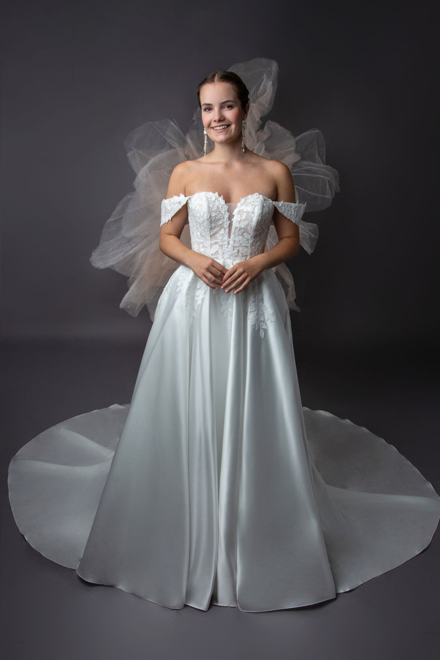 Lace bodice wedding dress with drop shoulder straps and satin full circular skirt